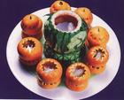 以肥嫩母鸡为主料,将鸡放入西瓜内,倒入鸡汤,并放进火腿片、笋片、香菇等,加原汤,盖上瓜盖,蒸几分钟后便可上桌。西瓜鸡味美清香,汤清瓜香,营养丰富,是苏州传统的时令名菜。