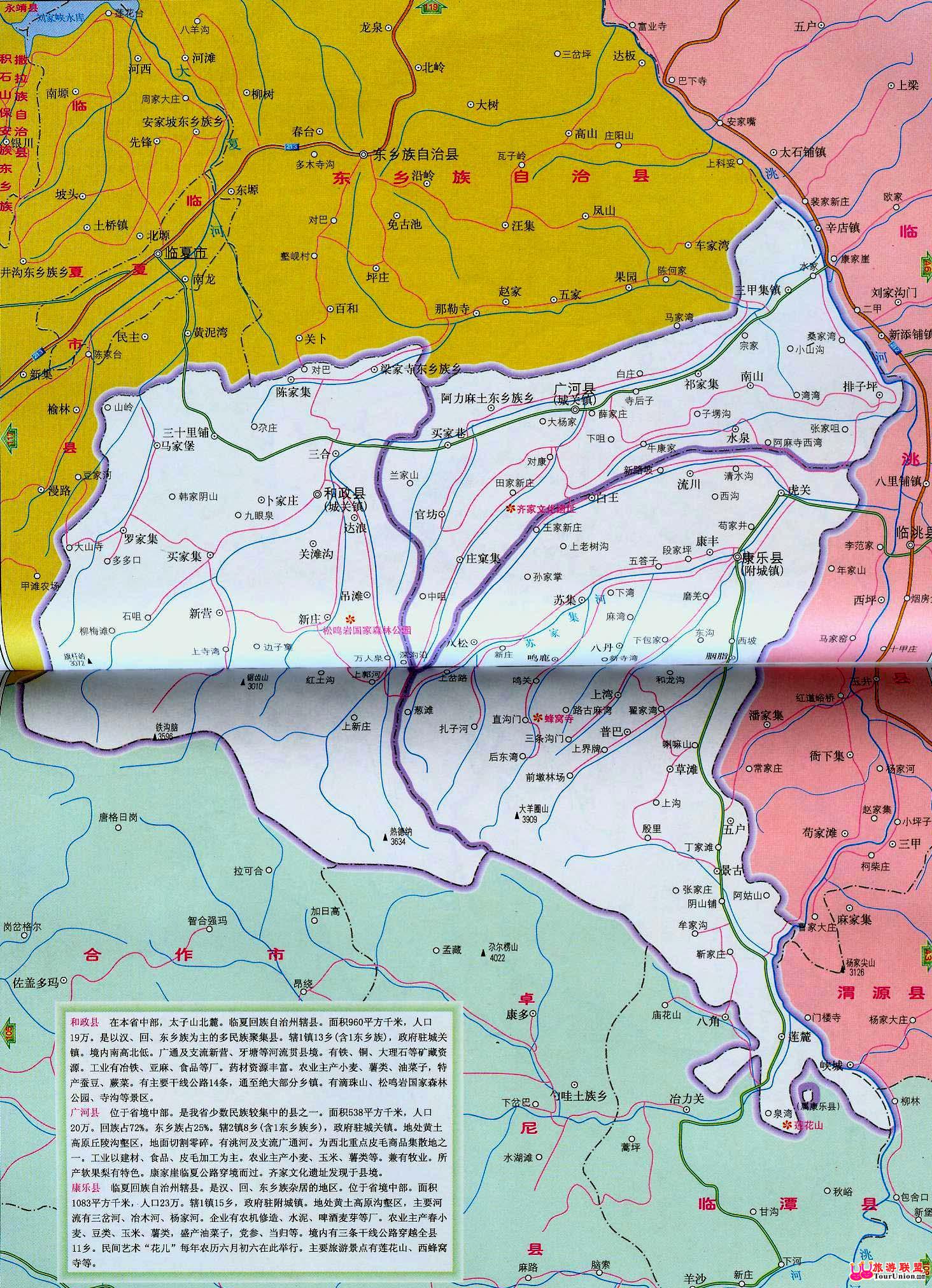 广河县地处甘肃省中部,临夏回族自治州东南部,东与定西地区临洮县隔河相邻,北靠东乡族自治县,西接和政县,南连康乐县。[旅游联盟2018/7/1提供:旅游资源大全,免费旅游交易平台,旅游社区,旅游软件,www.tourunion.com]位于东经102°23′ ——103°51′、北纬35°25′一35°28′之间。[旅游联盟2018/7/1提供:旅游资源大全,免费旅游交易平台,旅游社区,旅游软件,www.tourunion.com]东西长45公里,南北宽13公里,总面积538平方公里。[旅游联盟2018/7/1提供:旅游资源大全,免费旅游交易平台,旅游社区,旅游软件,www.tourunion.com]整个版图宛如一只奔兔。[旅游联盟2018/7/1提供:旅游资源大全,免费旅游交易平台,旅游社区,旅游软件,www.tourunion.com]广河县居于陇西黄土高原,地势自西南向东北倾斜,平均海拔1953米,最高的西南部大疙瘩,海拔2620米;最低的东部三甲集镇五户村,海拔1800米。[旅游联盟2018/7/1提供:旅游资源大全,免费旅游交易平台,旅游社区,旅游软件,www.tourunion.com]境内除中部广通河谷冲积阶地地势平坦外,其余地区则丘陵密布,沟壑纵横。[旅游联盟2018/7/1提供:旅游资源大全,免费旅游交易平台,旅游社区,旅游软件,www.tourunion.com]广河县有两条较大的河流——广通河、洮河。[旅游联盟2018/7/1提供:旅游资源大全,免费旅游交易平台,旅游社区,旅游软件,www.tourunion.com]广通河古称“大夏水”,由西向东流贯广河县腹地。[旅游联盟2018/7/1提供:旅游资源大全,免费旅游交易平台,旅游社区,旅游软件,www.tourunion.com] 县名来源于广通河名。[旅游联盟2018/7/1提供:旅游资源大全,免费旅游交易平台,旅游社区,旅游软件,www.tourunion.com]1919年设宁定县,1953年改置广通回族自治区,1955年改为自治县,1956年改为广通县,1957年改广河县。[旅游联盟2018/7/1提供:旅游资源大全,免费旅游交易平台,旅游社区,旅游软件,www.tourunion.com] 广河县辖5个镇、4个乡、1个民族乡:城关镇、三甲集镇、祁家集镇、庄禾集镇、买家巷镇、排子坪乡、南山乡、水泉乡、官坊乡、阿力麻土东乡族乡。[旅游联盟2018/7/1提供:旅游资源大全,免费旅游交易平台,旅游社区,旅游软件,www.tourunion.com] 广河县属温带半干旱气候区,春夏温和,秋季凉爽,冬季寒冷干燥。[旅游联盟2018/7/1提供:旅游资源大全,免费旅游交易平台,旅游社区,旅游软件,www.tourunion.com]年平均气温6.4C,最高气温32.6℃,最低气温一21,6℃。[旅游联盟2018/7/1提供:旅游资源大全,免费旅游交易平台,旅游社区,旅游软件,www.tourunion.com]平均降水量493,5毫米,蒸发量1257毫米。[旅游联盟2018/7/1提供:旅游资源大全,免费旅游交易平台,旅游社区,旅游软件,www.tourunion.com]全年无霜期142天左右,年平均日照2560小时,太阳总辐射量131.94千卡/平方厘米。[旅游联盟2018/7/1提供:旅游资源大全,免费旅游交易平台,旅游社区,旅游软件,www.tourunion.com] 广河县境内有着十分丰富的新石器时代文化遗存,驰名中外的马家窑文化、半山类型、齐家文化都首先发现于本县。[旅游联盟2018/7/1提供:旅游资源大全,免费旅游交易平台,旅游社区,旅游软件,www.tourunion.com]县内广泛分布的古文化遗址和丰富的出土”文物,吸引了中外考古学家纷至沓来,使广河县成为甘肃最著名的考古区之一。[旅游联盟2018/7/1提供:旅游资源大全,免费旅游交易平台,旅游社区,旅游软件,www.tourunion.com]广河县辖2镇8乡、102个行政村、1120个村民小组,1999年末全县有人口194310人,其中回族118095人,占总人口的60.7%、东乡族71955人,占总人口的37.1%、汉族4036人,占总人口的2.1%、其他民族224人,占总人口的0.1%。[旅游联盟2018/7/1提供:旅游资源大全,免费旅游交易平台,旅游社区,旅游软件,www.tourunion.com] 广河县经济以农业为主,农业人口占全县总人口的96.4%,耕地面积20.60万亩,人均耕地1.1亩。[旅游联盟2018/7/1提供:旅游资源大全,免费旅游交易平台,旅游社区,旅游软件,www.tourunion.com]旱涝保收基本农田人均0,5亩,60%以上是旱地。[旅游联盟2018/7/1提供:旅游资源大全,免费旅游交易平台,旅游社区,旅游软件,www.tourunion.com]农业基础薄弱,产量低而不稳,影响农业生产的主要灾害是旱灾。[旅游联盟2018/7/1提供:旅游资源大全,免费旅游交易平台,旅游社区,旅游软件,www.tourunion.com]近年来,县委、县政府坚持以农业为基础,以市场为导向,积极发展多种经营,稳定粮播面积,优化种植业结构,依靠科学技术,加大农业投入,因地制宜,推广应用塑料地膜覆盖和日光节能温室,间作套种等,主攻单产,增加总产。[旅游联盟2018/7/1提供:旅游资源大全,免费旅游交易平台,旅游社区,旅游软件,www.tourunion.com]小麦、玉米、洋芋为主要粮食作物, 胡麻、油菜为主要经济作物。[旅游联盟2018/7/1提供:旅游资源大全,免费旅游交易平台,旅游社区,旅游软件,www.tourunion.com] 『转自: 原创: ⊿若有差错,请来函更正』