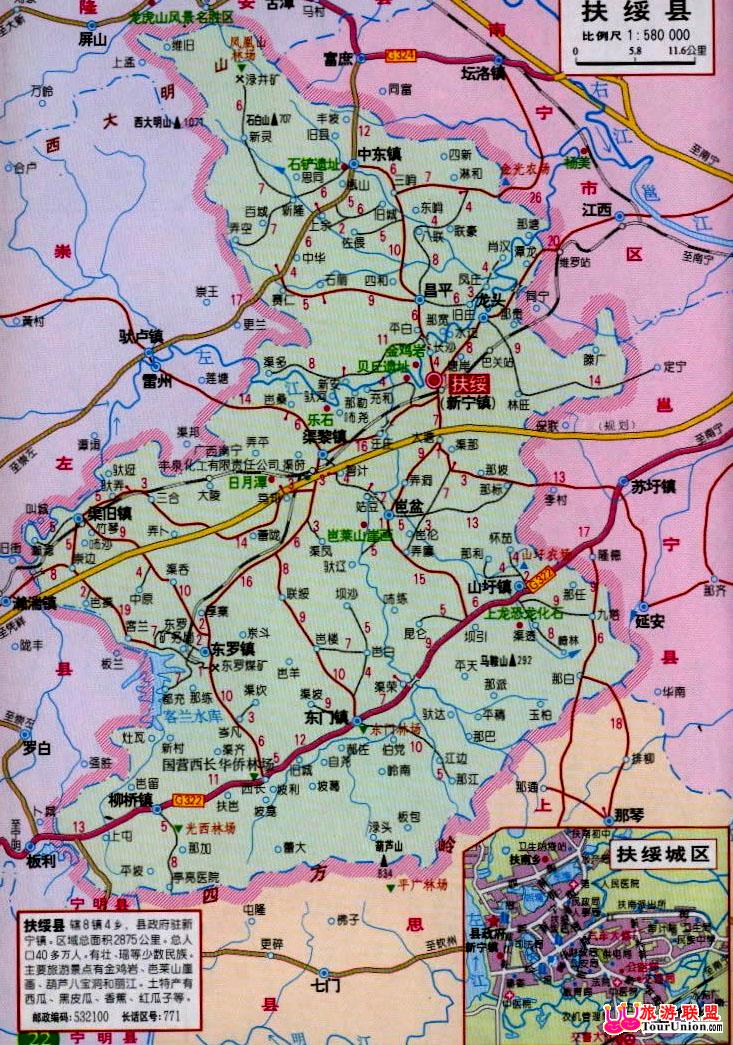 扶绥县地处东经107°3ˊ-108°6ˊ,北纬22°11ˊ-22°57ˊ之间,南北最大纵距78公里,东西最大横距55公里,位于广西壮族自治区西南部,土地总面积2836平方公里,占全广西面积1.22%。[旅游联盟2023/1/22提供:旅游资源大全,免费旅游交易平台,旅游社区,旅游软件,www.tourunion.com]西邻崇左市江洲区,南接防城市上思县,北靠南宁市隆安县,西南与崇左市宁明县交界,县治新宁镇与自治区首府南宁市直线距离仅45公里,地理位置优越。[旅游联盟2023/1/22提供:旅游资源大全,免费旅游交易平台,旅游社区,旅游软件,www.tourunion.com]县辖8镇3乡,共128个行政村、13个居委会,聚居有壮、汉、苗、瑶、侗等18个民族。[旅游联盟2023/1/22提供:旅游资源大全,免费旅游交易平台,旅游社区,旅游软件,www.tourunion.com]全县总人口41.4万人,在总人口中,壮族占82.8%,汉族占16.9%,瑶族占0.2%,其他少数民族占0.1%,其中县城常住人口5万人,农业人口33.1万人,其中农业劳动力15万人,劳力资源丰富。[旅游联盟2023/1/22提供:旅游资源大全,免费旅游交易平台,旅游社区,旅游软件,www.tourunion.com]