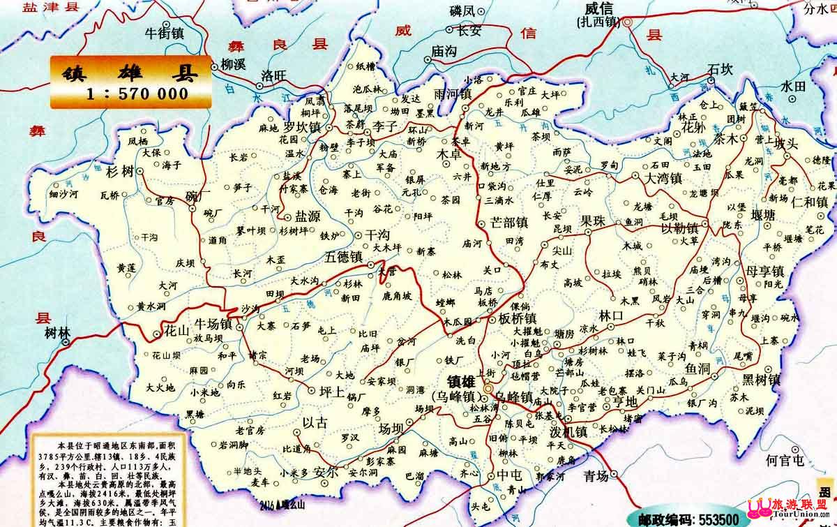 镇雄县位于昭通地区东部,与贵州、四川边界接壤,面积3686平方公里,现有 人口116.7万的镇雄县,地理位置偏僻,地形地貌复杂,境内出峦起伏,沟壑纵横, 道路崎岖,曾是中国工农红军长征四渡赤水转战之地,是革命老区。[旅游联盟2022/11/24提供:旅游资源大全,免费旅游交易平台,旅游社区,旅游软件,www.tourunion.com]由于受历代封建统治,加之,自然条件差,气候恶劣,一年之中各种自然灾害频繁发生,交通闭塞,物流不畅,在新中国建立之初,乃至五、六十年代,一直是一个生产力水平低下,人们缺吃少穿,被称为滇东北的贫困大县,1986年,被国务院列为国家重点扶持的全国592个特困县之一。[旅游联盟2022/11/24提供:旅游资源大全,免费旅游交易平台,旅游社区,旅游软件,www.tourunion.com] 『转自: 原创: ⊿若有差错,请来函更正』