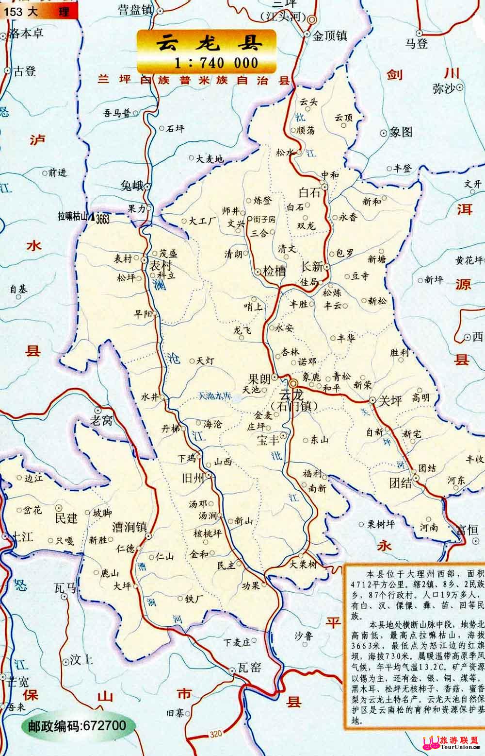 云龙县位于云南省西部,地处横断山南端澜沧江纵谷区,东经98°52′—99°46′,北纬25°28′—26°23′,之间,是大理州、保山地区、怒江州3个地州的结合部。[旅游联盟2023/1/11提供:旅游资源大全,免费旅游交易平台,旅游社区,旅游软件,www.tourunion.com]东与洱源县和漾濞县接壤,南与永平县、保山市相交,西与怒江州沪水县毗邻,北与剑川县、怒江州兰坪县交界。[旅游联盟2023/1/11提供:旅游资源大全,免费旅游交易平台,旅游社区,旅游软件,www.tourunion.com]东西最大横距91·8公里,南北最大纵距1109公里,总面积4400·95平方公里,全部是山区。[旅游联盟2023/1/11提供:旅游资源大全,免费旅游交易平台,旅游社区,旅游软件,www.tourunion.com]县城居县境中部狮尾河谷石门镇,东距大理州府大理市175公里,距省会昆明市574公里。[旅游联盟2023/1/11提供:旅游资源大全,免费旅游交易平台,旅游社区,旅游软件,www.tourunion.com] 旅游资源:玉皇阁建筑群,白衣阁,西竺寺 ,虎头山古建筑群 ,秀峰塔 ,飞龙桥望江楼 ,水城藤桥等。[旅游联盟2023/1/11提供:旅游资源大全,免费旅游交易平台,旅游社区,旅游软件,www.tourunion.com] 『转自: 原创: ⊿若有差错,请来函更正』