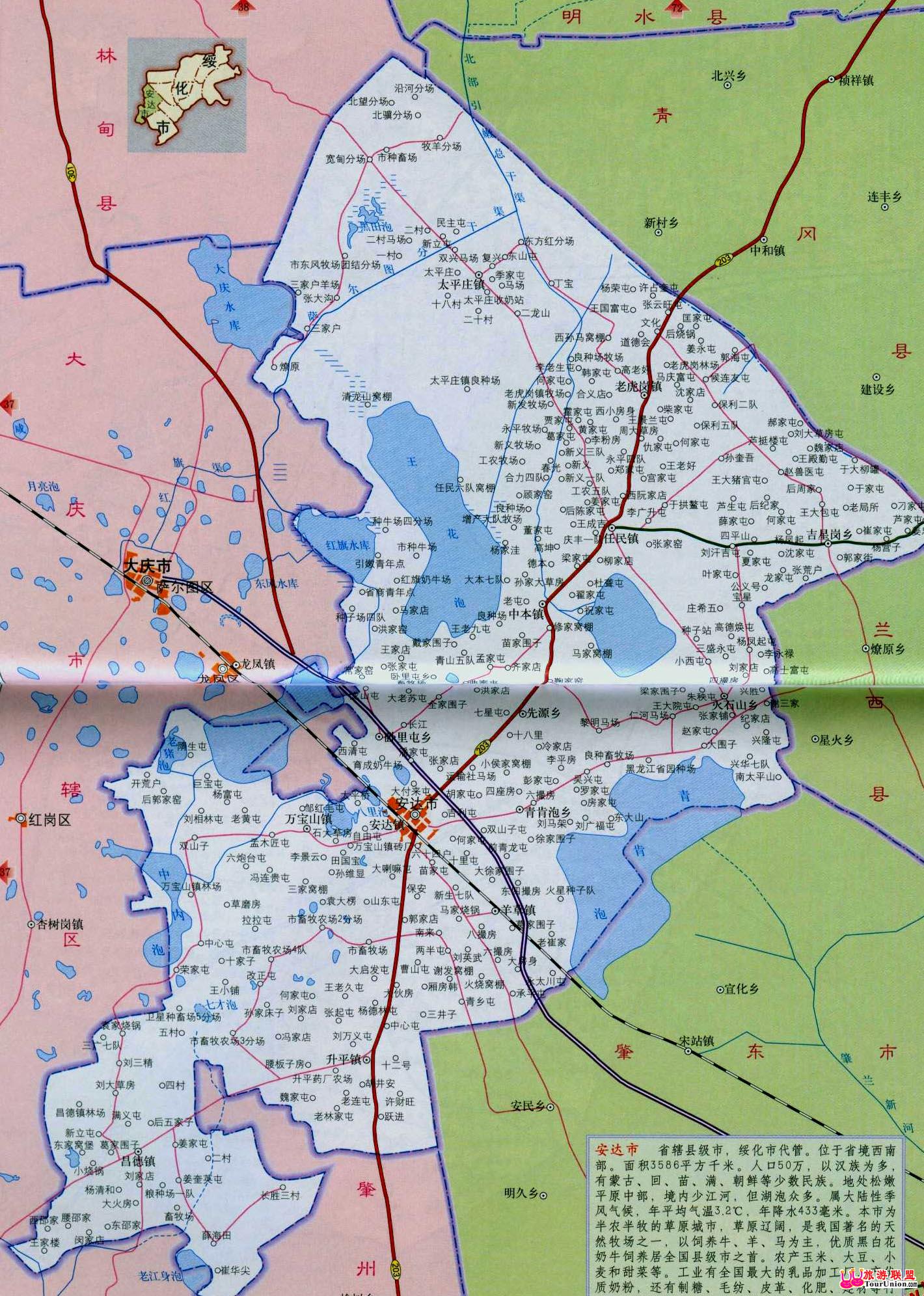 安达市地处黑龙江省西南部,松嫩平原腹地。[旅游联盟2017/7/16提供:旅游资源大全,免费旅游交易平台,旅游社区,旅游软件,www.tourunion.com]面积3586平方公里,辖10镇、9乡、4个农牧场和5个街道办事处。[旅游联盟2017/7/16提供:旅游资源大全,免费旅游交易平台,旅游社区,旅游软件,www.tourunion.com]有14个民族,总人口50万,其中城镇人口21万。[旅游联盟2017/7/16提供:旅游资源大全,免费旅游交易平台,旅游社区,旅游软件,www.tourunion.com] 安达市拥有许多得天独厚的自然资源。[旅游联盟2017/7/16提供:旅游资源大全,免费旅游交易平台,旅游社区,旅游软件,www.tourunion.com]全市有耕地10.5万公顷,草原18.1万公顷,植被构成以驰名中外的羊草为主,是亚洲东部特有的建群植物种,素有“世界名珠”之称。[旅游联盟2017/7/16提供:旅游资源大全,免费旅游交易平台,旅游社区,旅游软件,www.tourunion.com]年产优质牧草2亿公斤,大量出口日本等国。[旅游联盟2017/7/16提供:旅游资源大全,免费旅游交易平台,旅游社区,旅游软件,www.tourunion.com]境内有苇塘1.1万公顷,年产芦苇1.4万吨,是造纸工业的理想原料。[旅游联盟2017/7/16提供:旅游资源大全,免费旅游交易平台,旅游社区,旅游软件,www.tourunion.com]有水面2.5万公顷,年产鲜鱼7000多吨,开发渔业生产潜力较大。[旅游联盟2017/7/16提供:旅游资源大全,免费旅游交易平台,旅游社区,旅游软件,www.tourunion.com]地下资源丰富,水资源储量为74.1亿立方米,天然气储量116亿立方米,境内油田年产原油30万吨,具有发展石化工业的良好条件。[旅游联盟2017/7/16提供:旅游资源大全,免费旅游交易平台,旅游社区,旅游软件,www.tourunion.com] 『转自: 原创: ⊿若有差错,请来函更正』