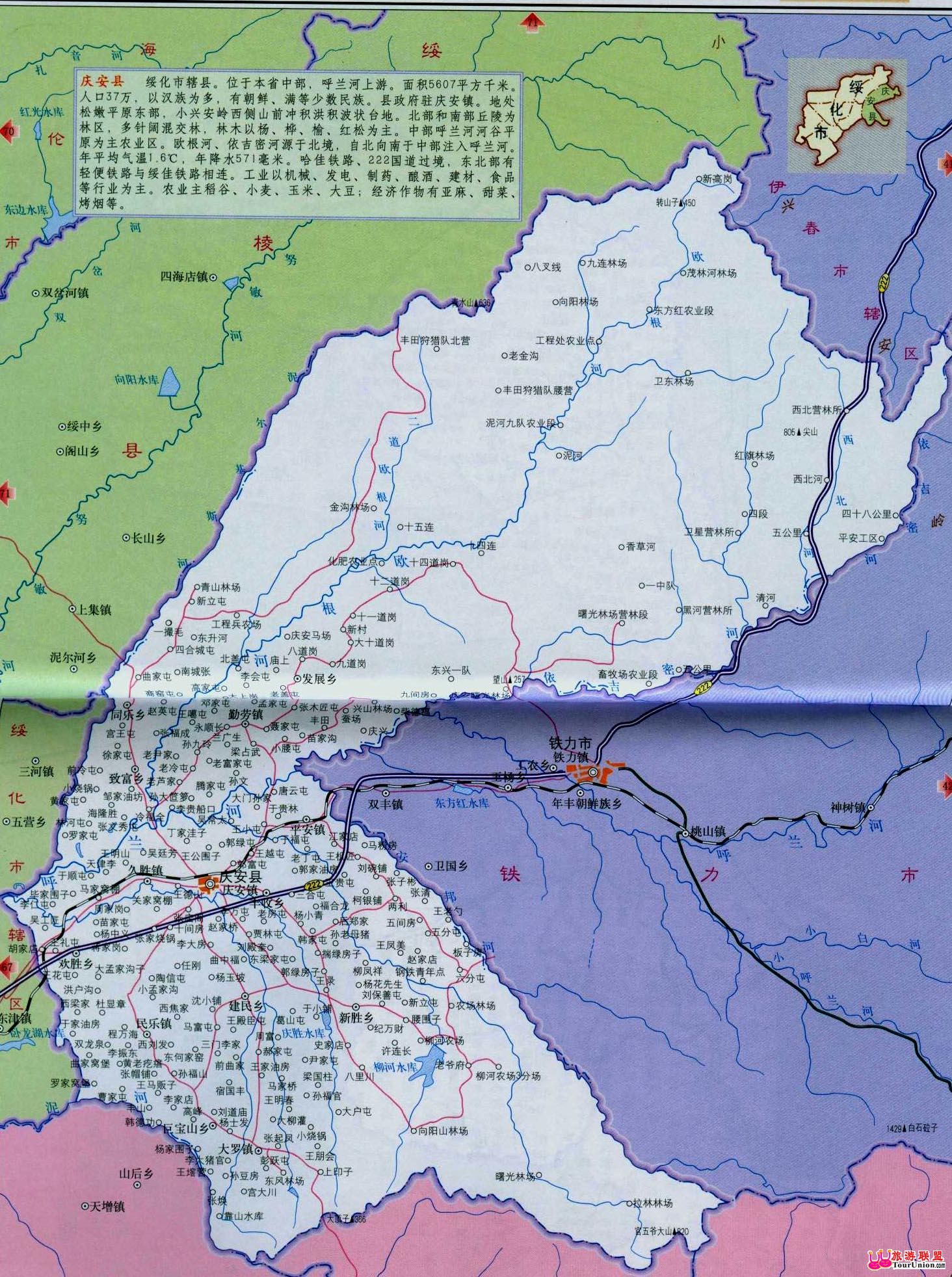 庆安县隶属于黑龙江省绥化市,位于黑龙江省中部,幅员总面积5,396平方公里,其中:平原2,183平方公里,丘陵山地2,389平方公里,全县36万人口。[旅游联盟2017/6/22提供:旅游资源大全,免费旅游交易平台,旅游社区,旅游软件,www.tourunion.com]