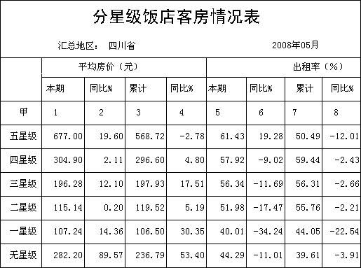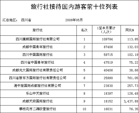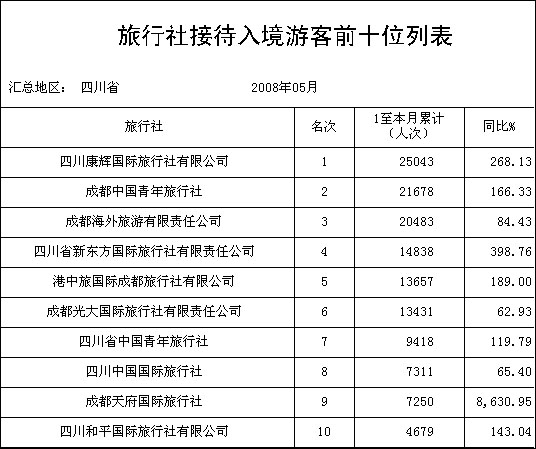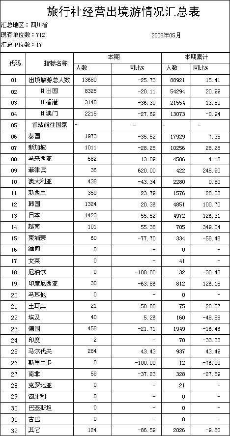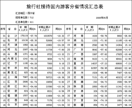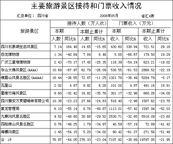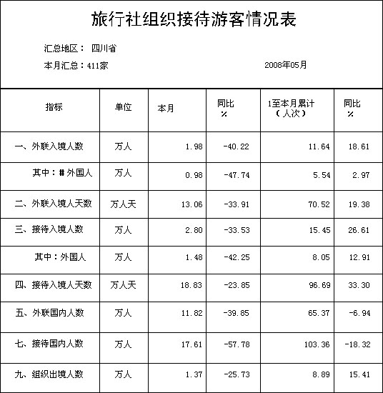 旅游总体情况统计表 2008年5月 四川省旅游局 指 标 单位 本期 同比增减(%) 累计 同比增减(%) 一、接待入境人数 万人次 4.14 -71.8 31.30 -23.0 其中: 外国人 万人次 2.85 -67.5 19.68 -16.1 台湾同胞 万人次 0.63 -84.8 6.02 -44.6 香港同胞 万人次 0.60 -63.2 4.83 -14.7 二、接待入境人天数 万人天 7.09 -67.5 54.27 -19.6 其中: 外国人 万人天 5.24 -61.6 35.92 -13.6 台湾同胞 万人天 0.74 -86.8 9.26 -42.4 香港同胞 万人天 1.03 -55.4 7.99 -9.5 三、外汇收入 万美元 1277.30 -67.6 9812.05 -19.8 四、国内旅游人数 万人次 759.62 -68.7 7382.64 -13.0 五、国内旅游收入 亿元 31.58 -64.7 402.08 -0.2 六、旅游总收入 亿元 32.51 -64.9 409.24 -0.8 『转自:四川旅游政务网 原创:政策法规处 ⊿若有差错,请来函更正』
