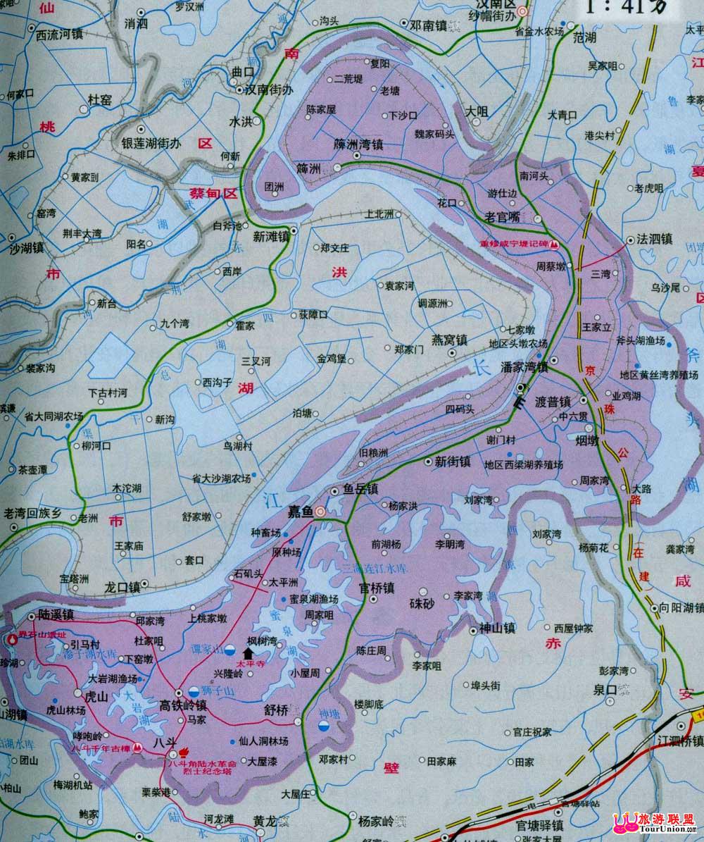 嘉鱼县位于长江中游南岸,湖北省东南部,咸宁市西北部,地属武汉城市圈,史称“武昌上游之邑,湘湖要冲之区”。[旅游联盟2022/11/30提供:旅游资源大全,免费旅游交易平台,旅游社区,旅游软件,www.tourunion.com]地跨东经113º39ˊ—114º42ˊ,北纬29º43ˊ—30º19ˊ。[旅游联盟2022/11/30提供:旅游资源大全,免费旅游交易平台,旅游社区,旅游软件,www.tourunion.com]东西宽17.5公里,南北长57.5公里,总面积1017.31平方公里。[旅游联盟2022/11/30提供:旅游资源大全,免费旅游交易平台,旅游社区,旅游软件,www.tourunion.com]嘉鱼县境内地势低平,地貌差异小。[旅游联盟2022/11/30提供:旅游资源大全,免费旅游交易平台,旅游社区,旅游软件,www.tourunion.com]海拔最低18米,最高243米,大部分高程在海拔19—50米,平原丘岗的自然区界轮廓分明,明显地形成由西南的高亢缓坡,渐至东北的低平地势,平原、丘岗兼有。[旅游联盟2022/11/30提供:旅游资源大全,免费旅游交易平台,旅游社区,旅游软件,www.tourunion.com]大体构成“一山、三水、四分田,两分道路和庄园”的自然格局。[旅游联盟2022/11/30提供:旅游资源大全,免费旅游交易平台,旅游社区,旅游软件,www.tourunion.com] 县城鱼岳镇,东北距离武汉市区路径80公里,东南距离咸宁市区路径71公里,距京珠高速公路嘉鱼连接线12公里,与京广铁路和107国道相距17 公里,长江水道纵贯县境120公里。[旅游联盟2022/11/30提供:旅游资源大全,免费旅游交易平台,旅游社区,旅游软件,www.tourunion.com] 是国家首批对外开放地区和长江经济带重要开发区。[旅游联盟2022/11/30提供:旅游资源大全,免费旅游交易平台,旅游社区,旅游软件,www.tourunion.com]