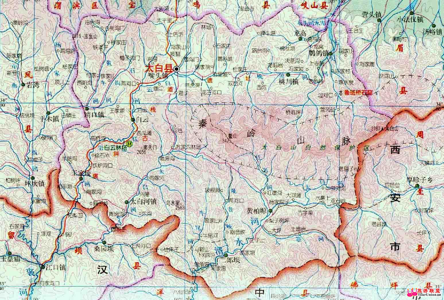 地形地貌:县内由北及南,北仰南缓,太白山居中东西展布隆起,形成中高、南北较低之地形大势,境内群峰耸立,山环水绕,海拔高在740--3767 米之间,相对高差达3000多米。[旅游联盟2023/1/11提供:旅游资源大全,免费旅游交易平台,旅游社区,旅游软件,www.tourunion.com]