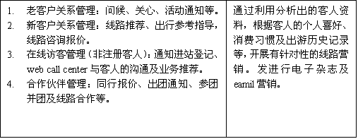 和因特网。中等规模的旅游公司未来将在CRM方面的投资大大增加。调查显示2002年,旅游公司在CRM上的投资将比现在增加一倍,因为中等规模的公司正面临着从大型旅游公司手中争夺客户的竞争。大部分旅游公司都把CRM看作是一项长期投资,而不是一个补救方案。多数公司都相信从CRM项目中获得收益需要一年的时间。CRM客户关系管理系统,可及时收集客户信息,能够提供《客户咨询综合报表》、《新增客户报表》、《客户投诉报表》、《新增渠道报表》等多项统计数据,有助于客服管理的规范化,并能够建立规范的销售、市场、服务等部门的协同工作流程,提升企业整体管理水平。