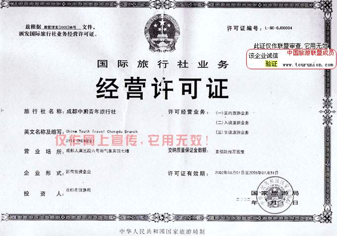 『实力作证』 全国百强旅游企业,四川省最具实力旅行社之一。 成都中国青年旅行社隶属于中国青旅集团和成都市旅游局。国际旅行社,全国10