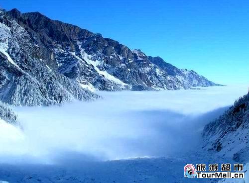 位于贡嘎山雪峰下的海螺沟景区,以低海拔现代冰川著称于世(世界上的冰川大多位于高海拔地区)。晶莹的冰川从高峻的山谷铺泻而下,飞起玉龙三百尺,将寂静的山谷妆点成玉洁冰清的琼楼玉宇。巨大的冰洞、险峻的冰桥,使人如置身于神话中的水晶宫。特别是举世无双的冰瀑布,高达1000多米,宽1100多米,比黄果树瀑布大10余倍,瑰丽非凡……在彻寒逼人的冰川附近,存有水温高达90℃的沸泉和热气蒸腾的温泉,冷热同时,温差悬绝,实为自然界一大奇观。