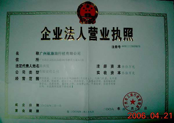 营业执照:点击放大查看 经营许可证:点击放大查看 税务登记证:点击放大查看 查看在旅游联盟的荣誉证书及其它单位颁发的荣誉证书 旅游联盟成员,请严格审查消费 查看此企业在旅游联盟上的诚信指数及信用档案
