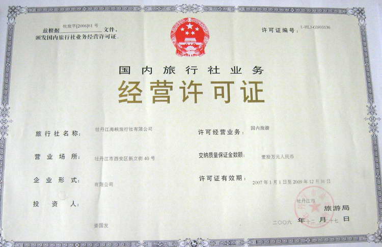 牡丹江江海峡旅行社有限责任公司是经牡丹江市旅游局批准成立,足额交纳质量 保证金的股份制旅游企业,具有独立的企业法人资格,在旅游、工商 等部门有着良好的企业信誉。 按照现代企业的要求引入竞争机制,建立自已的企业管理体系。凭借良好的旅游资源优势精心设计,开发有特色的旅游路线,不断推出独具竞争力的旅游新产品,遵循"质量第一,信誉第一"的原则,树立起了良好的企业形象,已经发展成为当地较具规模的旅行社。 牡丹江海峡旅行社有限责任公司长期坚持"以质量求生 存,以信誉求发展"的宗旨,依靠本地牢固的房、餐、车、票务等关系,由经验丰富,精湛的管理人员和一流的导游队伍提供服务,愿与各地旅行社建立密切的精诚合作关系。 |