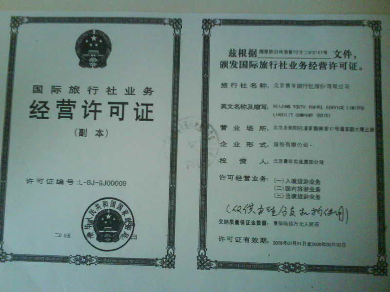 北京青年旅行社股份有限公司成立于一九八四年,是经国家旅游局批准,隶属于北京市旅游局和北京市青年联合会的国际旅行社。是国内实力雄厚的旅行社之一。 通过二十年的奋斗,北京青年旅行社股份有限公司已发展成为经营出境旅游、入境旅游、国内旅游、旅游车队、出租汽车、房地产、餐饮、咨询服务、广告及文化娱乐等多行业为一体的跨地区的综合性旅游企业集团。 北京青年旅行社股份有限公司拥有一大批熟悉旅游业务,受过专门培训的各级管理人员,并有曾荣获过全国先进导游员称号的多种语言的翻译导游队伍。