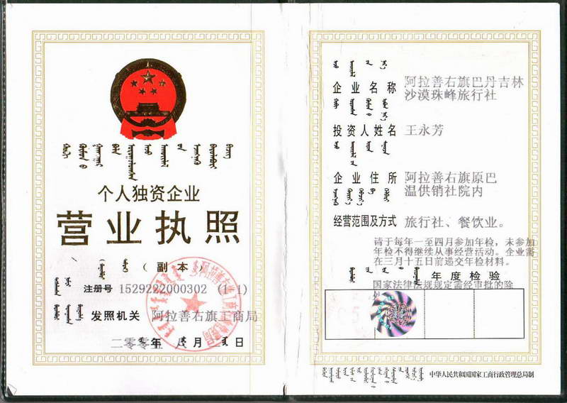 阿拉善右旗巴丹吉林沙漠珠峰旅行社注册成立于2005年10月,是经自治区、盟旅游局批准、阿右旗工商局注册的具有独立法人资格的旅游企业。珠峰旅行社是阿右旗旅游发展史上第一家国内旅行社,实现了阿右旗历史上旅游专营实体零的突破。 “ 沙漠珠峰” 的名称来源于巴丹吉林沙漠世界沙漠最高峰-必鲁图珠峰,从成立之初,我社就确立了 “ 巅峰、精华、专业、诚信”的经营宗旨。依托巴丹吉林沙漠神秘、神奇的旅游资源,业务开展以巴丹吉林沙漠特种旅游地接业务为主,同时经营国内各大旅游城市、旅游景区的组团业务。公司旗下拥有沙漠旅游专用车50余辆,负责巴丹吉林沙漠旅游所有的游客运输业务。巴丹吉林沙漠被誉为 “上帝划下的曲线、苍天缔造的神奇” , 在众多的沙漠景观中以 “ 千湖大漠 ” 独树一帜,彻底颠覆了沙漠“死亡之海”的定位。巴丹吉林沙漠以独有的空旷之美、阴柔之美使无数游客醉心其中,以蓝天、碧水、黄沙、绿草的浑然天成打造了中国沙漠第一景。