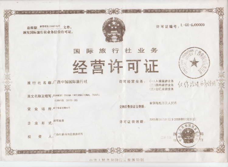 经过50年的发展,广西国旅拥有一支经验丰富的管理人员队伍和训练有素的翻译导游队伍,是南宁唯一一家拥有高级导游、全国优秀导游及翻译语种最全的国际旅行社,广西国旅职员曾多次被国家有关部门派驻到国外担任重要翻译工作,在国内更是经常承担高规格的接待和翻译任务。广西国旅在国内外有着广泛的合作网络,主要的经营范围有:入境旅游、出境旅游、国内旅游、边境旅游、会议会展商务旅游、代办签证、代订中国及世界各地的住房和机、车、船票等,是国家特许经营出境旅游、中越边境旅游的旅行社。它本着“质量第一、热情服务、诚信为本、互惠互利”的宗旨,为游客提供热情、周到的服务,赢得了客户和广大游客的信赖。广西国旅积50年之经验,一直致力于为中国及世界各地的游客精心打造自己的产品品牌,提供个性化的产品设计,合理的销售价格和规范的全程服务,努力为游客提供便捷、优质、安全的服务。