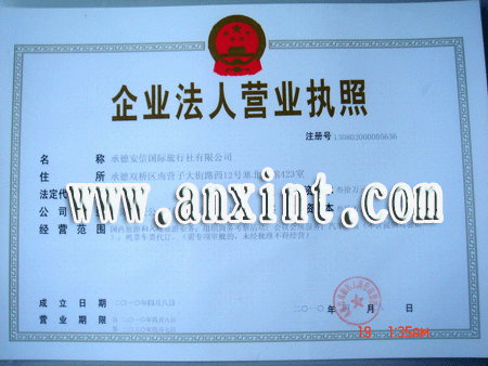 承德安信国际旅行社有限公司是旅游主管部门批准,工商局注册,具有独立法人资格的正规旅游企业,本公司拥有丰富的业务人员、训练有素的导游队伍、健全的管理体制,本公司的主要业务:组织和接待商务旅游、承办各种会议、商务考察、疗养、代订机、车票;订房、订餐、车辆出租、导游等业务。 我公司的经营理念:安为上,信为本,以质量求生存,以信誉求发展愿与全国同行真诚合作共创佳绩!请合作者放心!让旅游者称心!