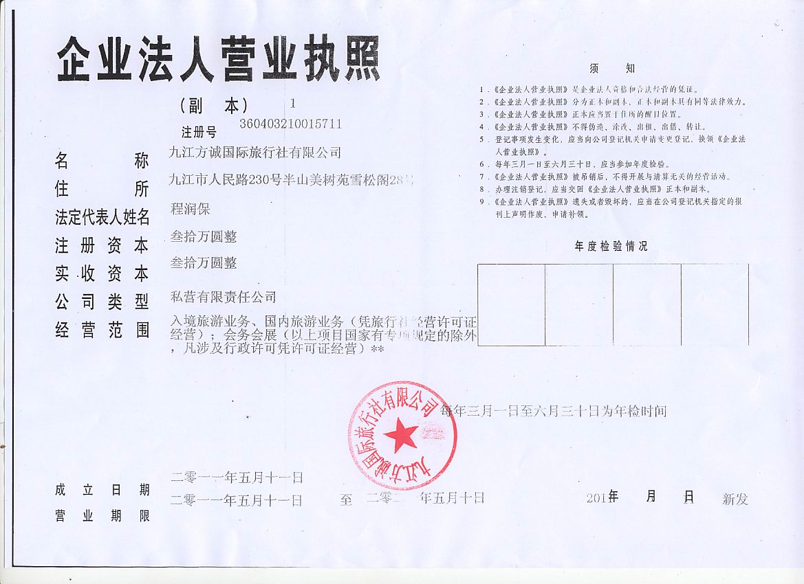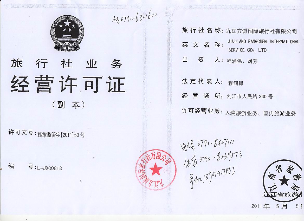 九江方诚国际旅行社有限公司,是经江西省旅游局批准、省工商局登记注册的地区知名旅游企业,并已全额交纳了旅游质量保证金(许可证号:L—JX00818)。公司具有独立法人资格、拥有丰富专业经验和优良资质,是能提供全方位旅游出行、酒店预定、会务会展等服务的综合性旅游企业。我社前身是成立于1993年的九江蓝天旅行社,由于业绩突出、为创品牌, 2011年创建九江方诚国际旅行社有限公司。“细致成就未来、诚信游遍八方!”社名也由此得来。