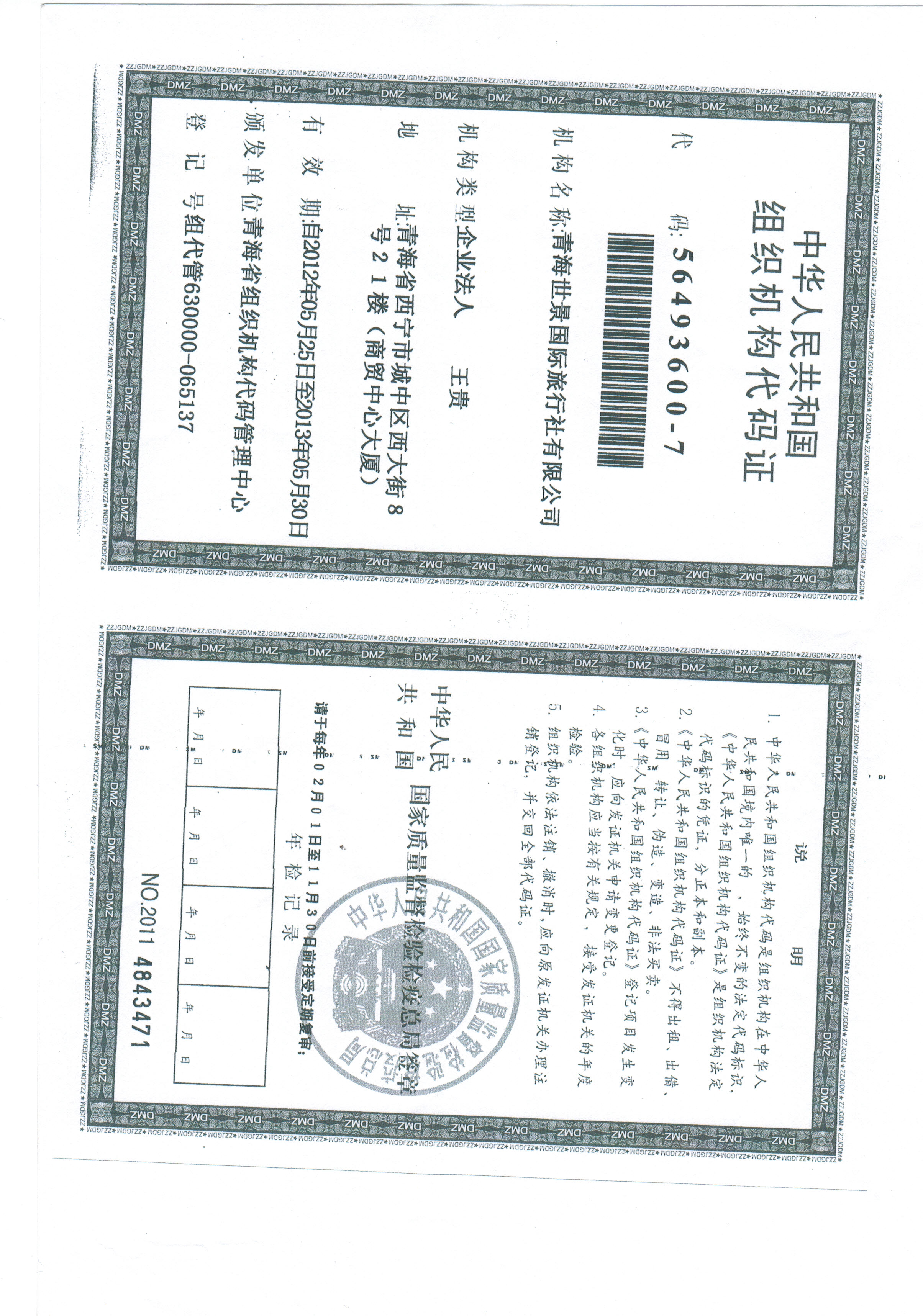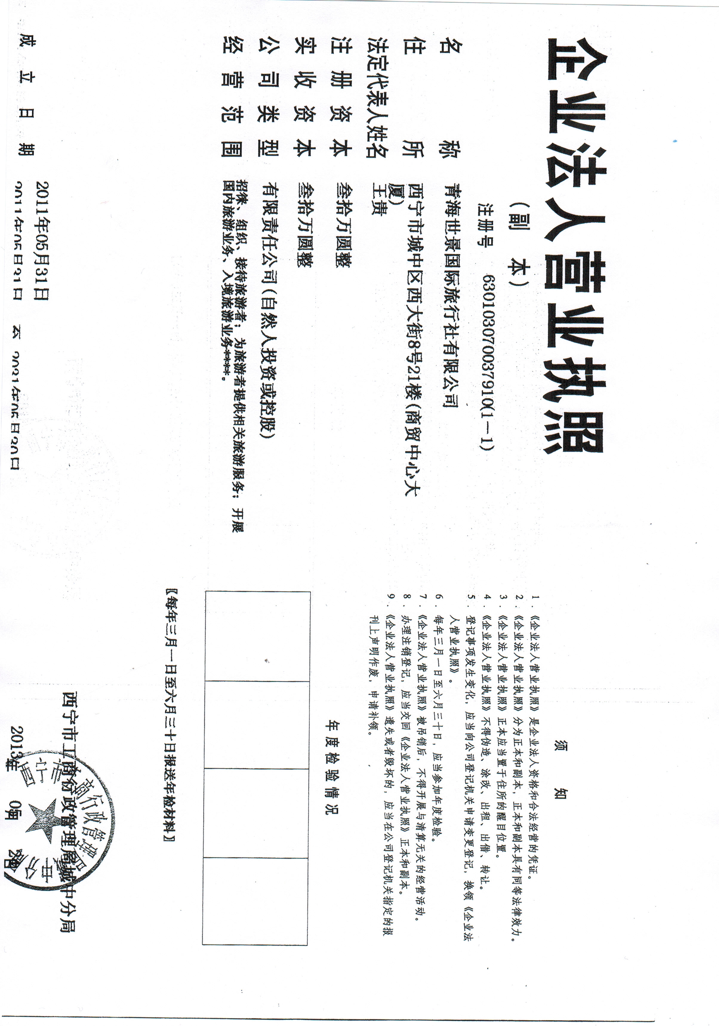 青海世景国际旅行社有限公司(西宁世景会议会展服务有限公司):是经有关政府主管部门批准,专门从事组织、承办会议会展服务,承接各种国内外旅游服务的专业机构。业务遍布国内外,是一家集会议接待、商务考察、观光旅游、培训等业务为一体的综合性、现代化的大型企业。